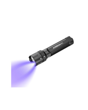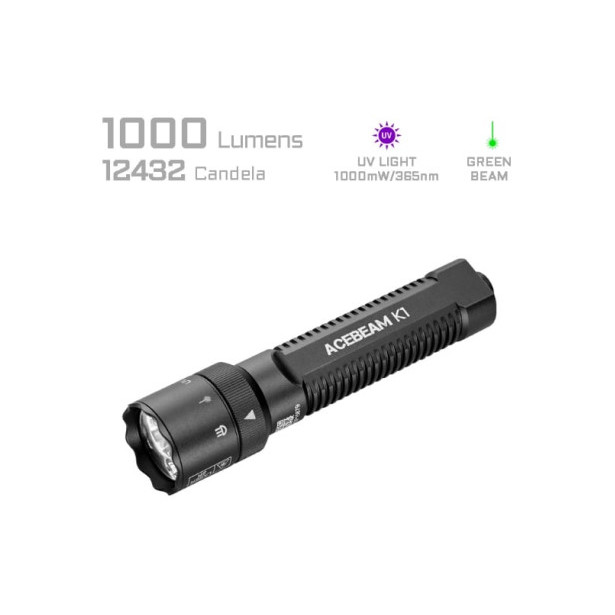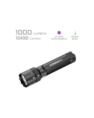 ACEBEAM K1 to kompaktowa latarka EDC z trzema źródłami światła: białą diodą LED CREE XP-LR 6500K o mocy 1000 lumenów i zasięgu 223 metrów, zieloną wiązką dla precyzyjnego celowania oraz lampą UV o długości fali 365 nm i mocy wyjściowej 1000 mW, która pozwala dostrzec ukryte detale. Obrotowy przełącznik magnetyczny umożliwia łatwą regulację trybów, a tylny włącznik umożliwia szybkie włączanie i wyłączanie. Latarka K1 jest wyposażona w akumulator USB-C o pojemności 14500 mAh i jest kompatybilna z bateriami AA. Wykonana jest z wytrzymałego aluminium AL6061-T6 z twardą anodą klasy wojskowej. Posiada stopień ochrony IP68, co zapewnia wodoodporność i pyłoszczelność, a także odporność na upadki z wysokości do 1,5 metra, co czyni ją idealną do trudnych warunków. Ważąc zaledwie 77,4 g (2,73 uncji) i mając 110 mm (4,33 cala), K1 posiada wygodny klips umożliwiający łatwe mocowanie, co czyni go idealnym towarzyszem na kempingu, podczas pieszych wędrówek lub do codziennego użytku.