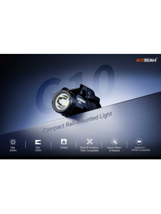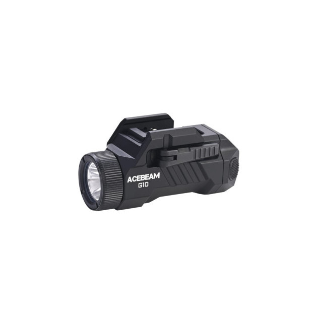 Latarka taktyczna G10 z szybkim demontażem, montowana na szynie, umożliwia szybki demontaż lub montaż bez użycia narzędzi i bez konieczności dotykania lufy. Wystarczy obrócić jej unikalną metalową osłonę w górę lub w dół, aby zapewnić kompatybilność G10 z szynami Glock i Picatinny. Przesuwna szyna zapewnia optymalną pozycję palców. Latarka jest zasilana dołączonym akumulatorem 16340 USB-C lub standardową baterią CR123A. Maksymalna moc światła 600 lumenów i zasięg 200 metrów, czas pracy do 70 minut. Waga zaledwie 87 g/3,06 uncji.